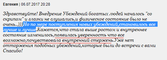 РЕЗУЛЬТАТ: прямо в ходе занятия вы сняли 2-3 своих самых сильных подсознательных блокировки денег. И это дало возможность получения большого дохода (часто - неожиданного) уже в скором времени.